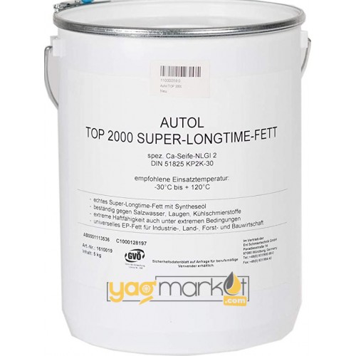 • AUTOL TOP 2000, araçların yanı sıra tarım, ormancılık ve inşaat makinelerinin yağlanması için aşırı basınç gresidir. Özellikle yağlama noktalarının neme, tuzlu suya, gübreye, bitki koruyucu maddelere maruz kaldığı ve depolama sıcaklığının 100 ° C’yi aşmadığı durumlarda, NLGI sınıf 2’nin yumuşak kıvamından dolayı, bu yağ aynı zamanda düşük sıcaklıklarda iyi taşınabilir ve tüm yıl boyunca merkezi yağlama sistemlerinde uygulanabilir.